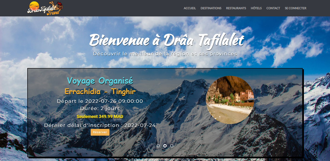 A travel agency website for Morocco's Drâa-Tafilalet region — interactive Google Maps, tour packages, hotel listings, restaurant recommendations, and an AJAX contact form.